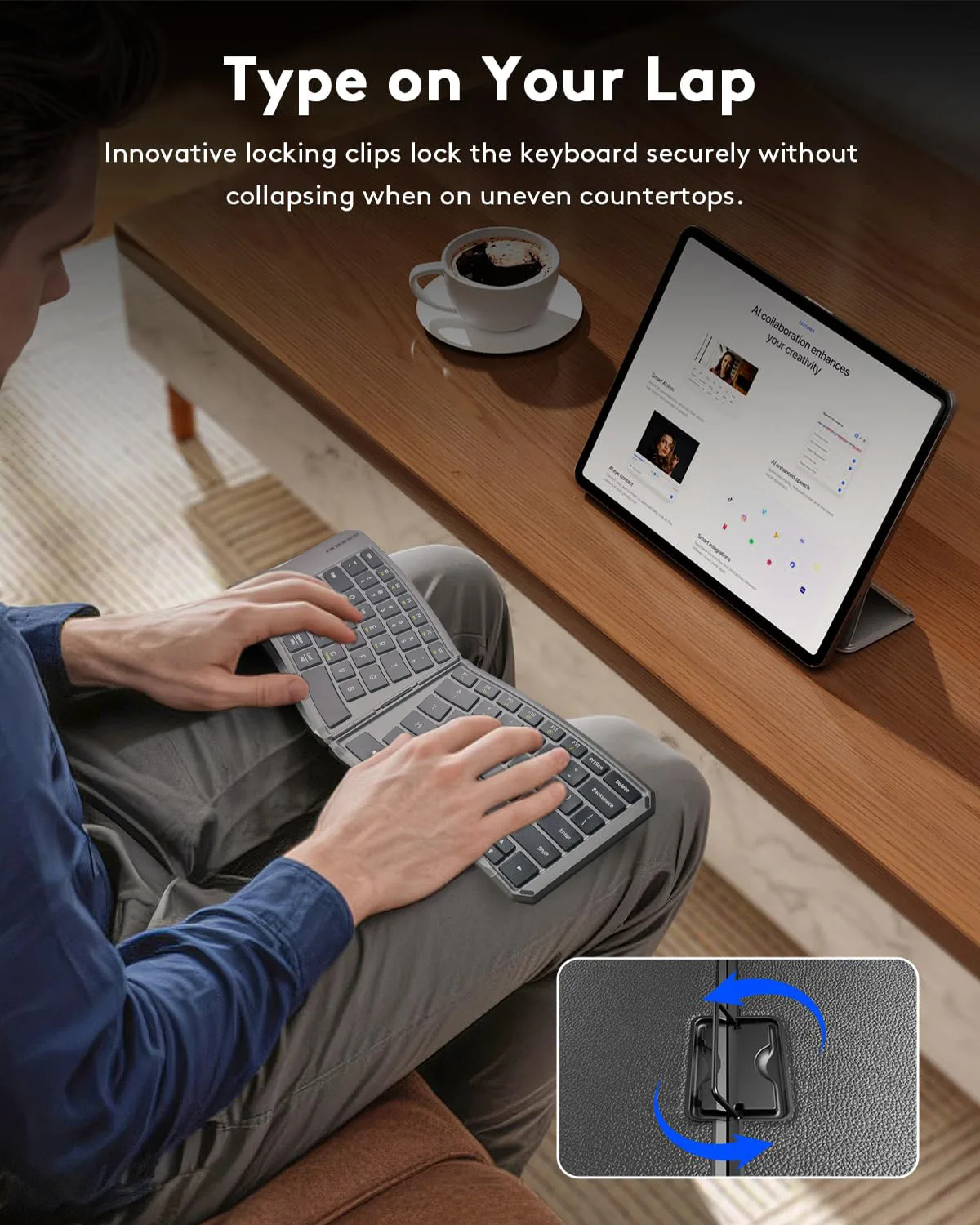 【Dual-Mode Foldable Keyboard】 6-row layout form designed for effortless precision, which is used to create an ergonomic foldable keyboard that can be used wherever you work or travel. Innovation Reverse-lock slot design ensures that the foldable keyboard wont bend and keep flat when typing on your knees.Strike a balance between portability and practicality~