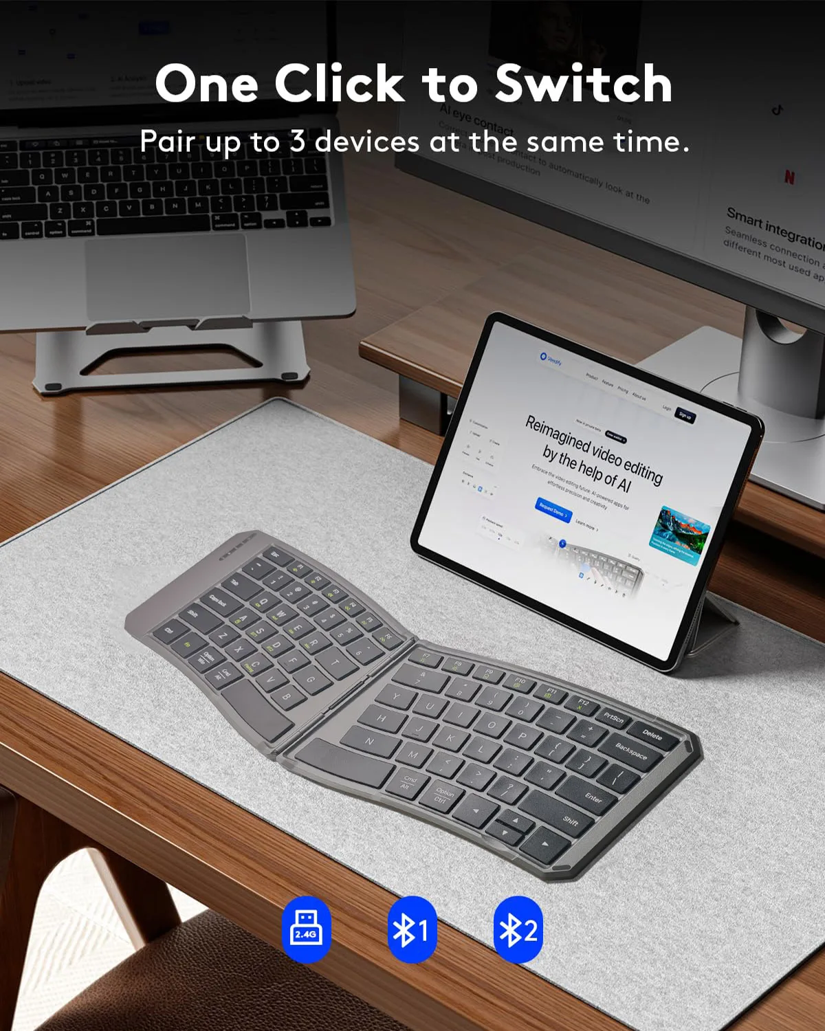 【One Button Easy Switching】2025 upgraded version of folding bluetooth keyboard, providing extremely stable and fast Bluetooth and 2.4G connection. Greatly enhanced connection stability relative to most others. One-click seamless switching between three devices instead of reconnecting