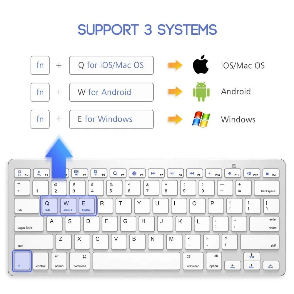 When the keyboard is successfully connected to the device, press FN+Q(ios) or W(Android) or E(windows) to switch the keyboard to the corresponding system mode of the current device.