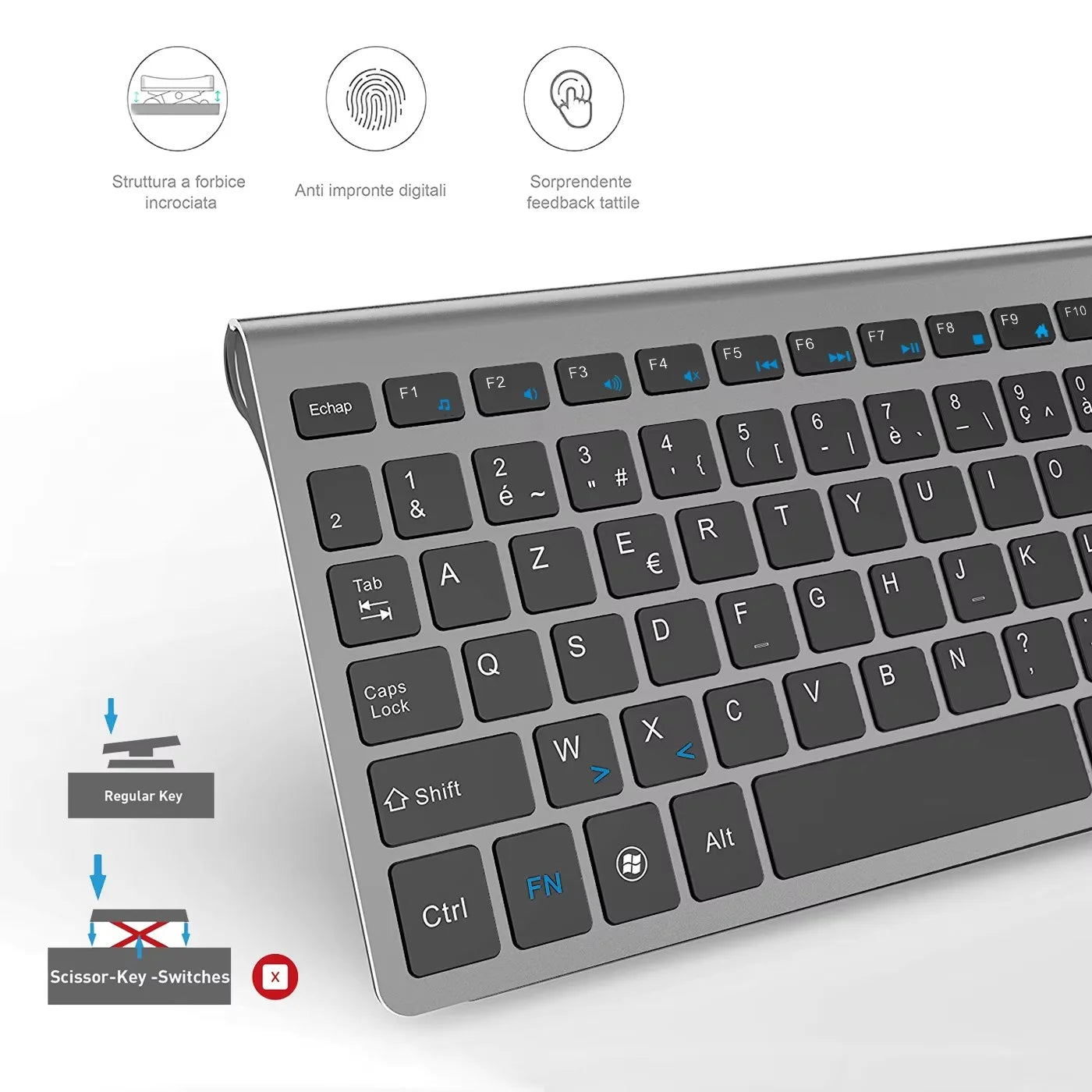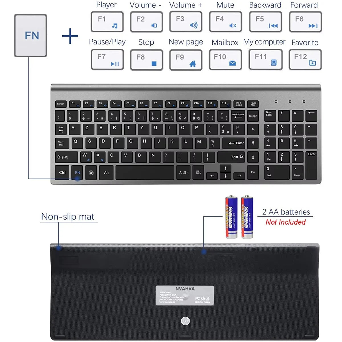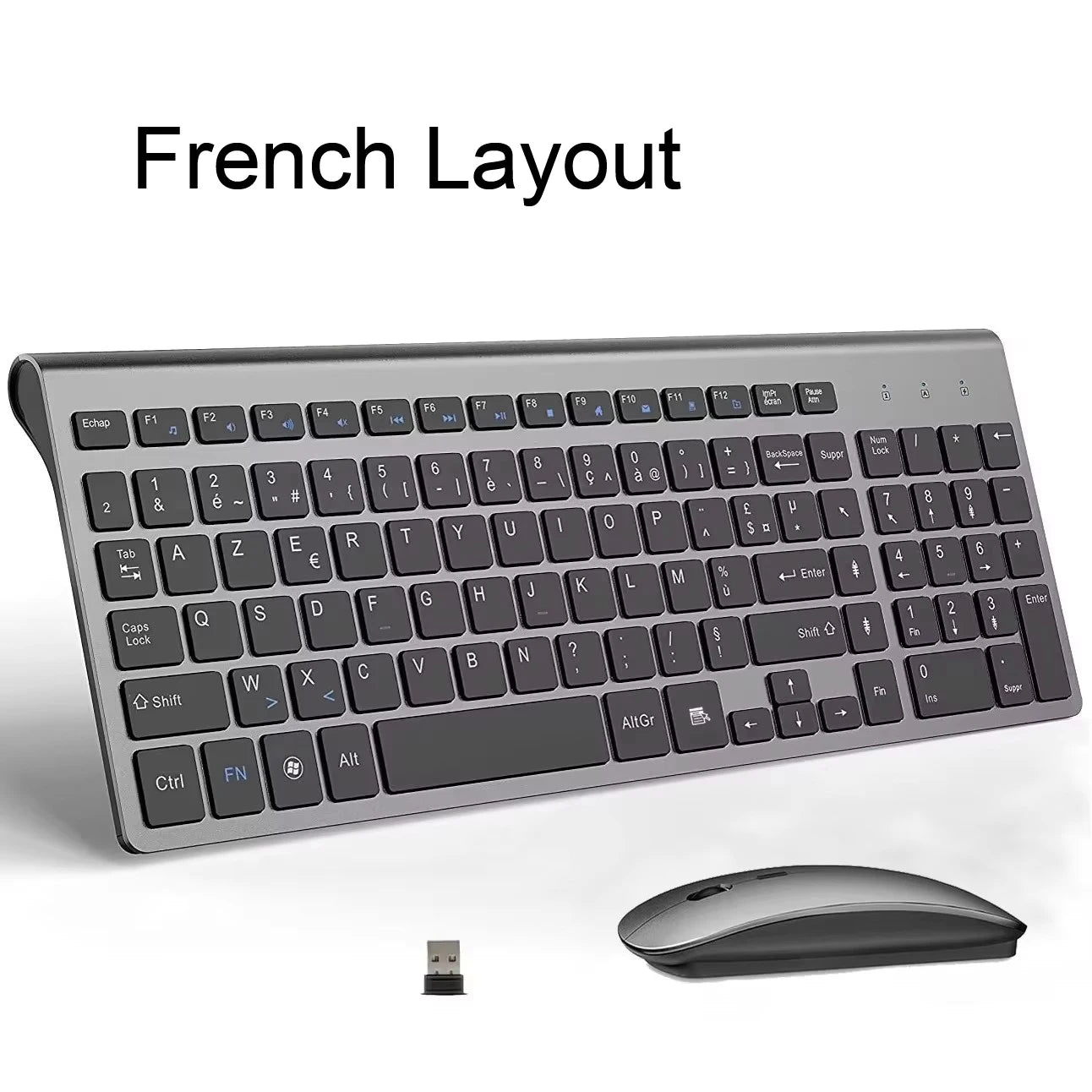 The keyboard is in French layout, if you find that the keyboard output is not in French (AZERTY) layout, please add Français (France) input method to your system so that the output characters are the same as on the keyboard