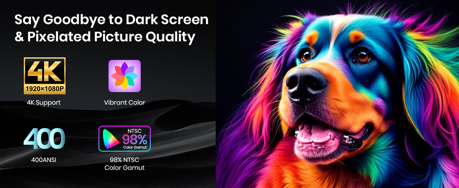【Say goodbye to dark screens | 500 ANSI | 4K Support】This latest mini projector from 2025 has a native Full HD resolution of 1080p and a brightness of 500 ANSI lumens. The 4K TV projector displays over 50% more vivid details than other projectors with 1080p support, and 4K support takes video quality to a new level. Experience a vivid and immersive visual experience.