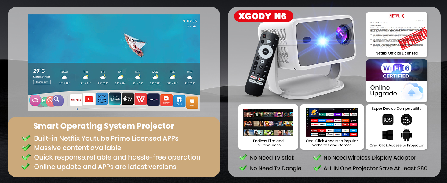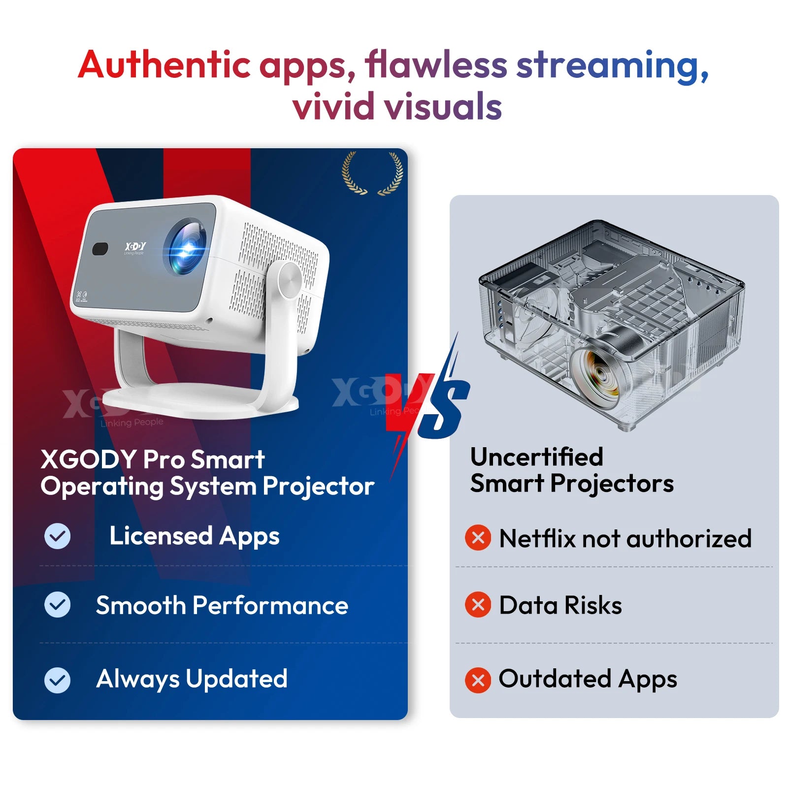 【Officially Licensed Netflix Projector | Android 13.0】The XGODY N6 Smart 4K Projector comes pre-installed with officially licensed Netflix, Prime Video, and YouTube. With just one click, you can access over 1,000,000 FHD videos. You can also download your favorite apps from the APP STORE. You don't have to worry about connecting other devices like a TV stick. P.S.: All other Android TV projectors require additional devices to watch official Netflix videos.