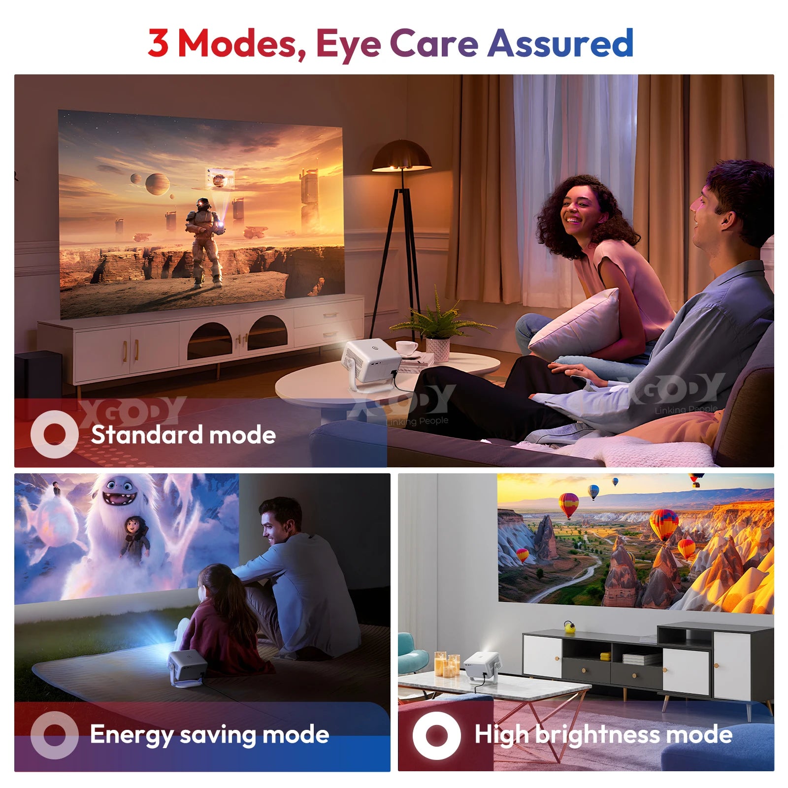 【Three Brightness Adjustment Modes】The XGODY N6 smart projector has three brightness adjustment modes: Energy Saving Mode, Standard Mode, and High Brightness Mode. The brightness of Energy Saving Mode is more suitable for watching movies in dark environments. High Brightness Mode is better suited for watching movies indoors in natural light. You can adjust the applicable mode yourself in different brightness environments.